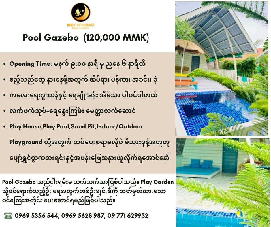 Baby Myanmar Play Garden is a family-friendly destination where families can play, rest, and swim together in a peaceful and fun-filled environment. It’s the perfect place for families to relax and enjoy quality time together. Our garden offers a harmonious blend of fun and relaxation, with activities designed to cater to both kids and adults. We provide a variety of gazebos and pools to suit every family’s needs, along with affordable entrance fees to ensure that everyone can join in the fun.